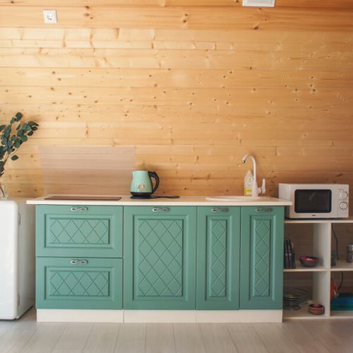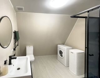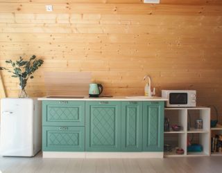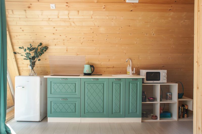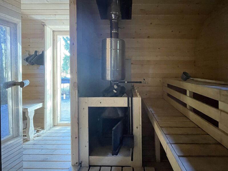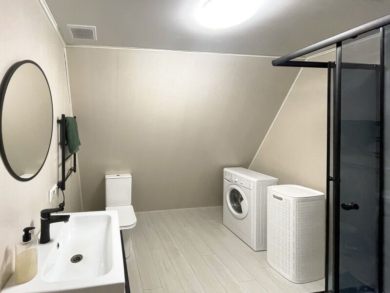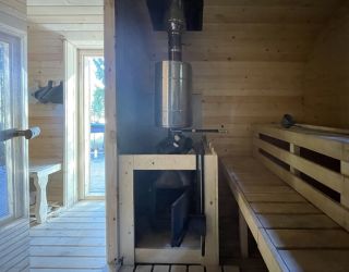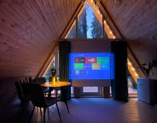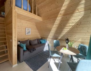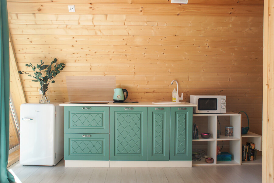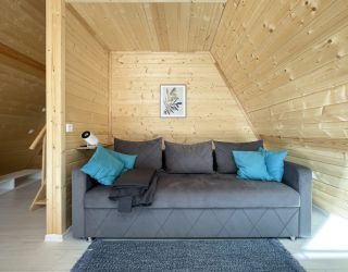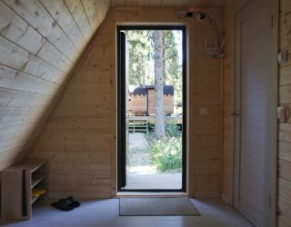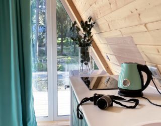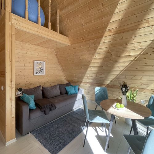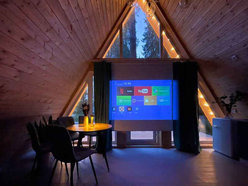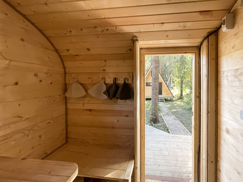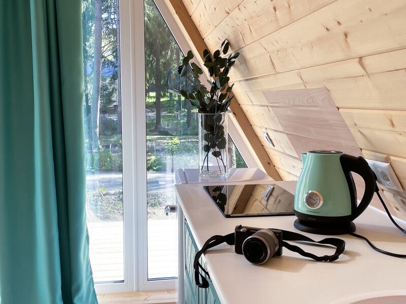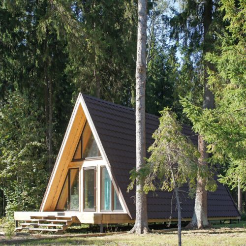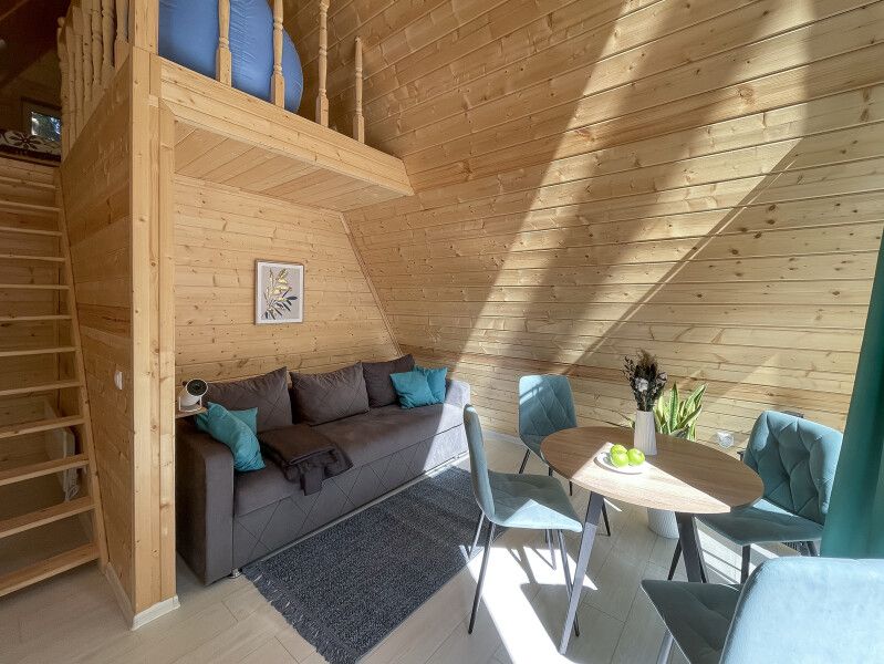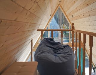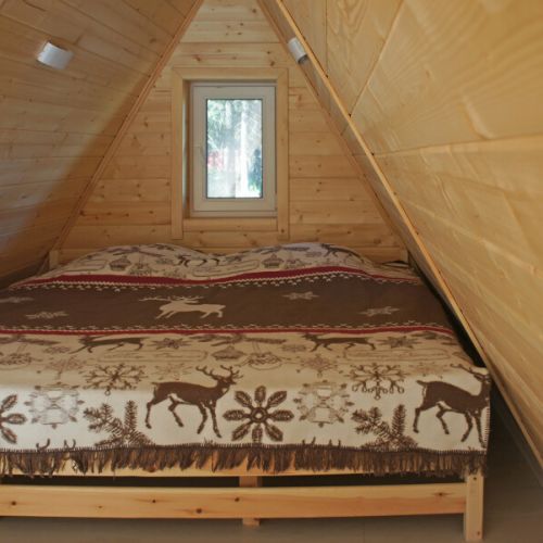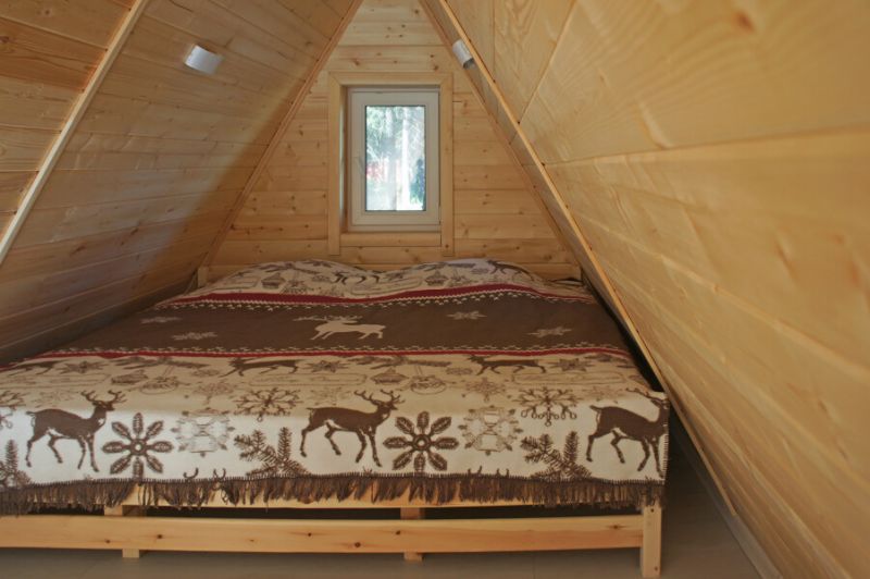 К размещению гостей предлагается уютный домик А-фрейм, вместимостью на 2 человека. Площадь 40 квадратных метров. На 2 этаже расположена двуспальная кровать King Size, на первом — раскладной диван. Самостоятельная организация питания возможна на полностью оборудованный кухне. Для этого есть мини-холодильник, электрическая плита, электрический чайник и полный набор посуды. Уютный дом-шалаш оснащен баней с купелью и проектором для просмотра любимых фильмов.